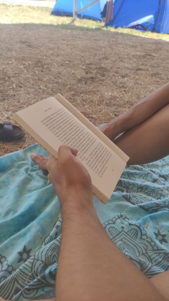 Όταν όμως δεν ακούγαμε μουσική, δεν κολυμπούσαμε και δεν κοιμόμασταν, υπήρχε χρόνος για να την αγαπημένη μας συνήθεια. Φυσικά, είχαμε κάνει την απαραίτητη προετοιμασία και έτσι είχαμε για συντροφιά μας ένα βιβλίο. Εγώ διάλεξα το “στο ΕΑΤ-ΕΣΑ, μια μαρτυρία για τα χρόνια της Δικτατορίας”, ενώ ο φίλος μου τη “Μεταμόρφωση” του Κάφκα (δεν του άρεσε). Για καλή μας τύχη υπήρχαν και άλλοι άνθρωποι που άραζαν με βιβλία τόσο στην παραλία όσο και στο καφέ όπου φόρτιζαν τα κινητά μας κι έτσι δεν νιώθαμε νέρντουλες, όχι περισσότερο τουλάχιστον από μια παρέα που έπαιζε σκάκι.