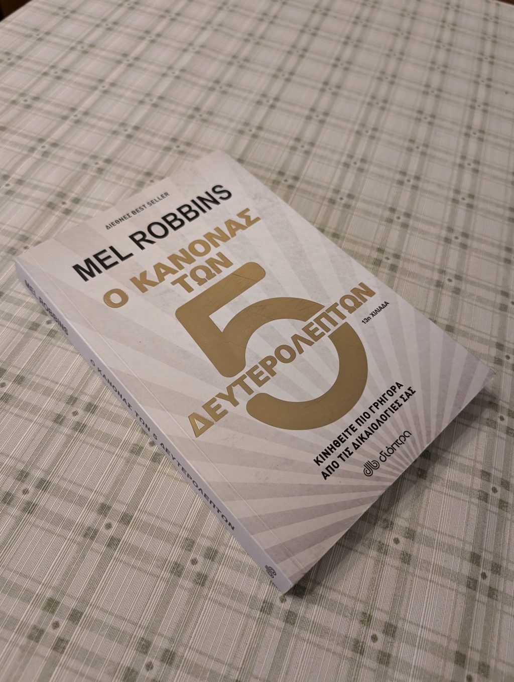 Ο «Κανόνας των 5 Δευτερολέπτων» της Mel Robbins από τις εκδόσεις Διόπτρα είναι ένα βιβλίο που σε κερδίζει από την πρώτη επαφή μαζί του με την απλότητα και τα παραδείγματά του. Η κεντρική ιδέα του βιβλίου είναι μια τεχνική που προτείνει η συγγραφέας, με την οποία αντιμετωπίζουμε την απροθυμία μας να κάνουμε κάτι, είτε λόγω αναβλητικότητας, είτε λόγω φόβου. Ουσιαστικά μετράμε αντίστροφα από το 5 έως το 1 και μετά ξεκινάμε χωρίς δεύτερη σκέψη. Απλή τεχνική που μας αφυπνίζει και ζωντανεύει την επιθυμία να κάνουμε σημαντικά πράγματα στην καθημερινότητά μας.